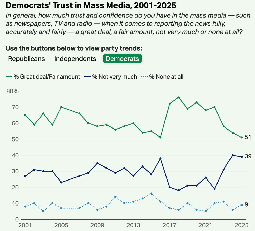 At the time, scholars of this topic noted that, in Trump's first term, the independence of institutional media orgs from him went with a surge in trust in the media from Democrats. Major media org's cooption and capitulation in Trump's second term has gone with a drop in Democrats' media trust.
